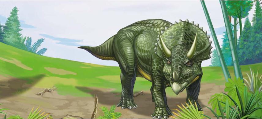 1877年,美国科罗拉多州丹佛市郊,工人在工地上发现了一对大角。当时著名的古生物专家,耶鲁大学教授马什将其鉴定为史前野牛的角。但是,马什教授的权威鉴定遭到了一名叫科罗斯的年轻学者的质疑。科罗斯是一名地质学家,他曾经在发现大角的地方作过研究,判断那个地层是属于中生代的白垩纪,所以他认为这很可能是恐龙的化石。后来,在这块区域又出土了很多这种带角的动物化石,而且发现化石的地层被确定为白垩纪地层,从而确定了这是一种新的恐龙——三角龙。