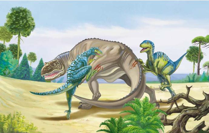 安静的午后,太阳温暖地照耀着大地,偶尔有几只蜻蜓飞过,在湖面上留下一片涟漪。突然,一阵慌乱的脚步声从湖滨小平原的尽头传来,一只植食恐龙向着湖边飞奔而来,在它的身后,是一条3米长的肉食恐龙,那只肉食恐龙的速度非常快,奔跑的时候尾巴和背部几乎保持了水平。它的头微微扬起,两只铜铃般的眼睛死死盯着前面的恐龙。植食恐龙越跑越快,马上就要逃到湖里了。后面的恐龙岂能让它得逞,它纵身一跃,两只利爪紧紧地抓住了植食恐龙的肩。然后,它张开那满是利齿的大嘴,奋力撕咬着植食恐龙的脖颈。植食恐龙疼得在地上乱滚。肉食恐龙看准机会,提起它右脚上的利爪,捅进植食恐龙的肚子,然后顺着一划,植食恐龙的腹部顿时血流如注,倒在血泊中。在白垩纪的北美大陆和亚洲,这样的悲剧时常发生。