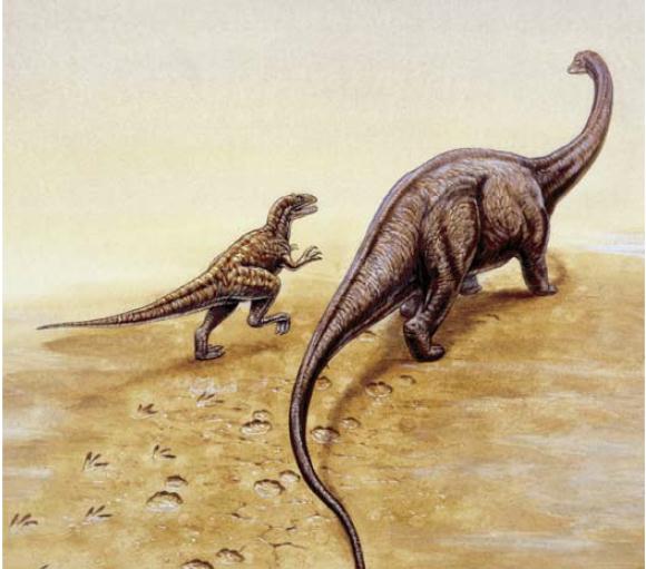 在发现雷龙化石的同时,古生物学家们还在干硬的泥岩上发 现了这种恐龙的足迹化石。当时的学者估计这种动物的体重是现在大象的6倍,它行走时大地应该会发出雷鸣般的声音。于是,就将它命名为“雷龙”,意思是“打雷的蜥蜴”。