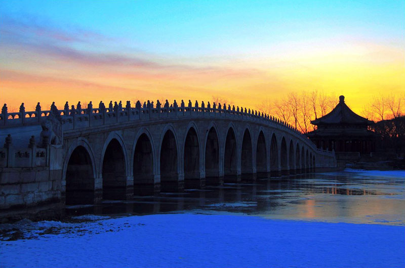卢沟桥位于北京西南郊的永定河上,联拱石桥。桥始建于金大定二十九年(公元1189年),成于明昌三年(公元1192年),元、明两代曾经修缮, 清康熙三十七年(1698年)重修建。桥全长212.2米,有11孔。各孔的净跨径和矢高均不相等,边孔小、中孔逐渐增大。全桥有十个墩,宽度为5.3米至7.25米不等。桥面两侧筑有石栏,柱高1.40米,各柱头上刻有石狮,或蹲、或伏,或大抚小,或小抱大,共有485头。石柱间嵌石栏板,高85厘米,桥两端各有华表、御碑亭、碑刻等,桥畔两头还各筑有一座正方形的汉白玉碑亭,每根亭柱上的盘龙纹饰雕刻得极为精细。卢沟桥以其精美的石刻艺术享誉于世。芦沟桥久已闻名中外。意大利人马可·波罗的《马可·波罗行纪》一书,对这座桥有详细的记载。1937年七七事变在此发生,是日本帝国主义侵略中国本土的开始,芦沟桥因此成为有历史意义的纪念性建筑物。
