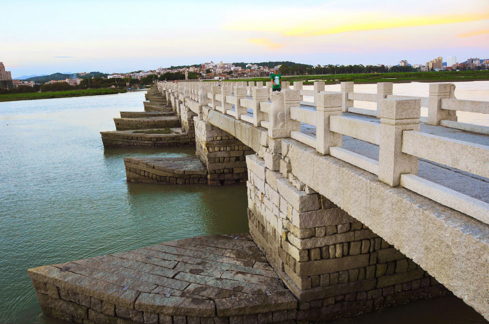 洛阳桥原名万安桥,位于福建省泉州东郊的洛阳江上,中国现存最早的跨海梁式大石桥。宋代泉州太守蔡襄主持建桥工程,从北宋皇佑四年(公元1053年)至嘉佑四年(公元1059年),前后历七年之久,耗银一千四百万两,建成了这座跨江接海的大石桥。桥全系花岗岩石砌筑,初建时桥长360丈,宽1.5丈,武士造像分立两旁。造桥工程规模巨大,工艺技术高超,名震四海。建桥九百余年以来,先后修复十七次。现桥长731.29米、宽4.5米、高7.3米,有44 座船形桥墩、645个扶栏、104只石狮、1座石亭、7座石塔。桥之中亭附近历代碑刻林立,有“万古安澜”等宋代摩岩石刻;桥北有昭惠庙、真身庵遗址;桥南有蔡襄祠,著名的蔡襄《万安桥记》宋碑,立于祠内,被誉为书法、记文、雕刻“三绝”。 洛阳桥是世界桥梁筏形基础的开端,为全国重点文物保护单位。