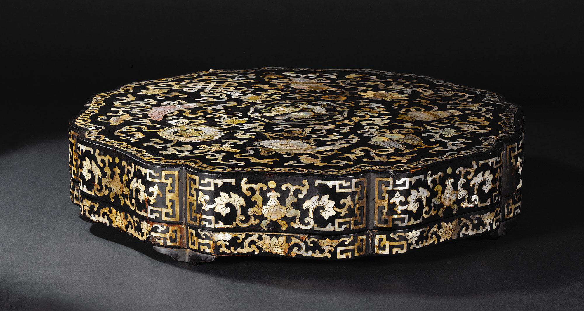 《髹饰录》中描述道:“螺钿……百般文图,点、抹、钩、条,总以精细密致如画为妙。又分截壳色,随彩而施缀者,光华可赏。”意即按照画面花纹的需要,采用不同色泽的螺片,裁切成各种不同的形状,镶嵌出各种画面,达到近似设色的效果。