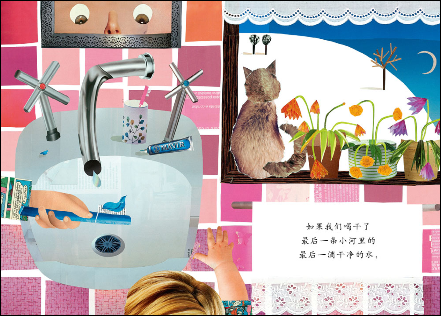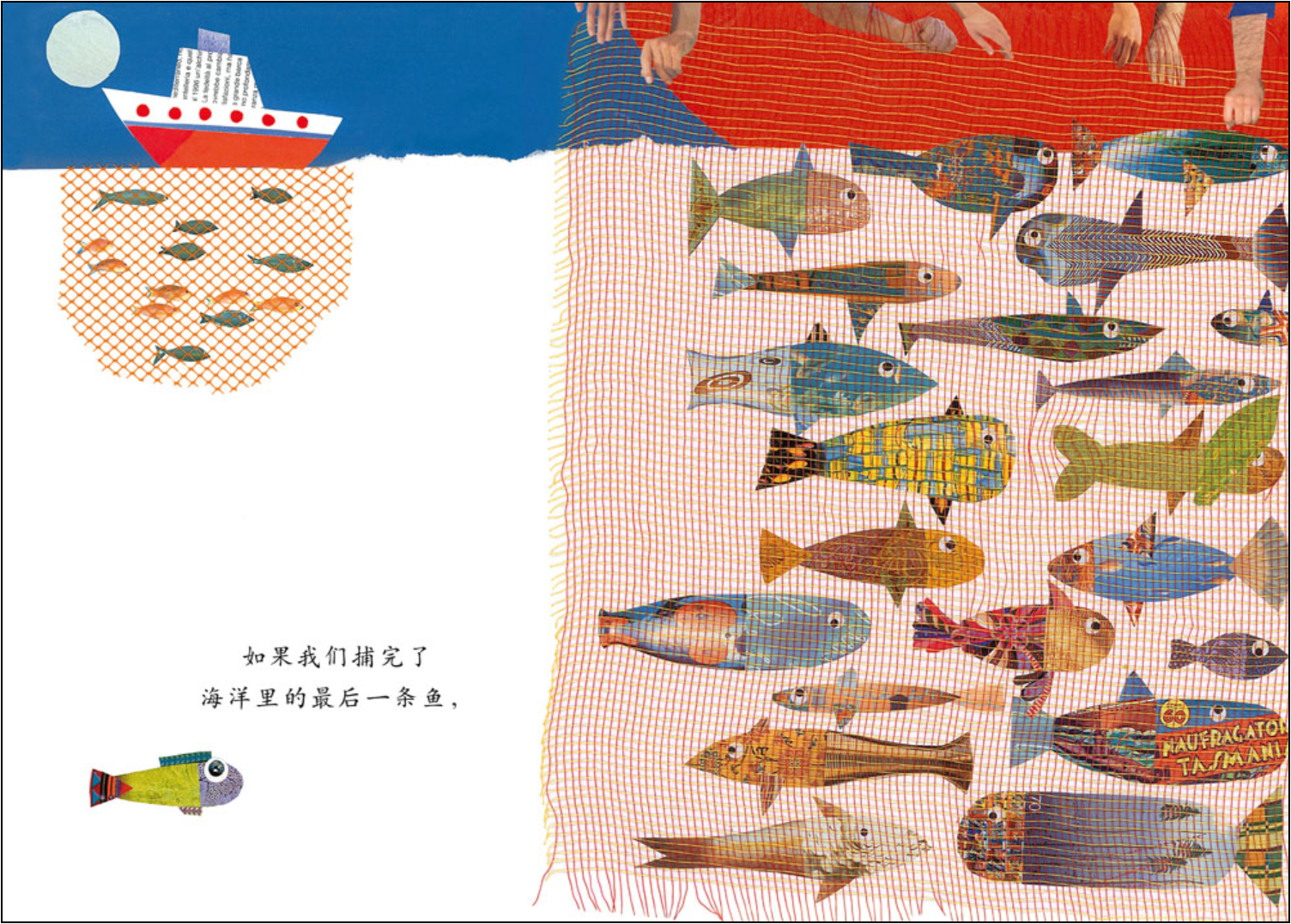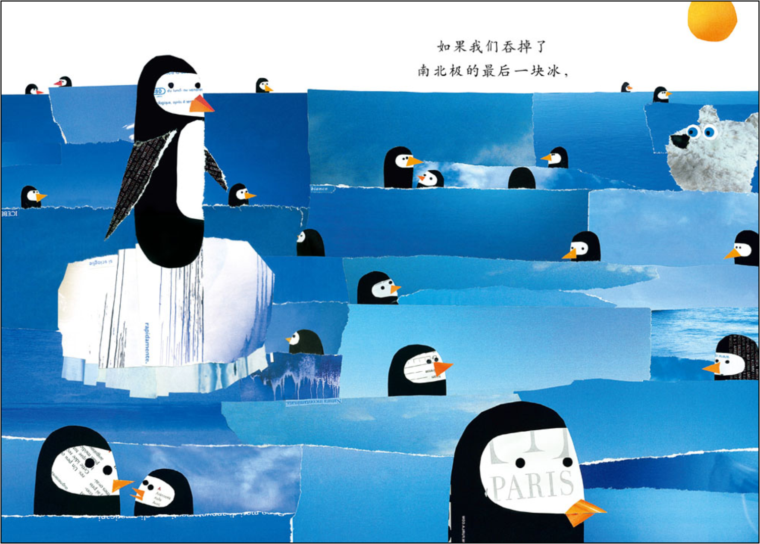 导读:如果地球就这样被我们一口一口地吃掉了……,即使不识字的孩子也看得懂这本书。从那些掉进海里的企鹅和北极熊无助的眼神里,从那些鱼儿逃脱不掉被网住的命运里,从没有水的水龙头、枯死的树、耷拉着脑袋的花、干渴的小猫到孩子惊恐的大眼睛里……。人们只剩 下了钱和金子的无奈――既不能吃喝、也不能呼吸的钱和金子,即使孩子也会为这样的未来而眉头紧锁,忧心忡忡