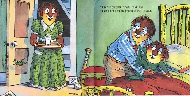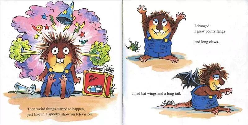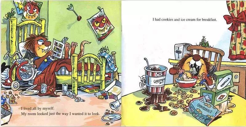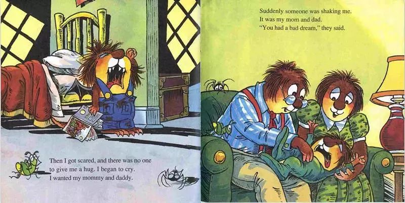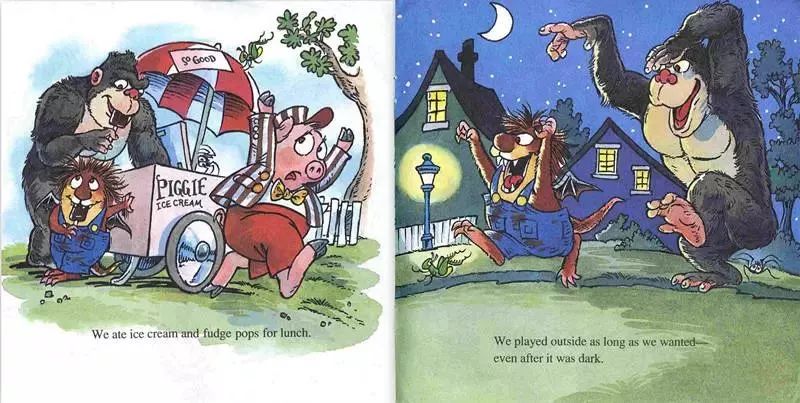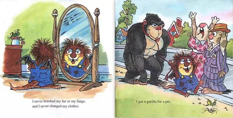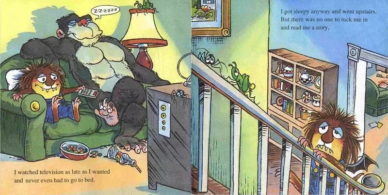 分享小毛怪系列故事,名字叫《What a Bad Dream》,小毛怪Litter Critter做了一个梦,他梦到自己长出了尖尖的牙齿和长长的尾巴,他拥有了一双蝙蝠的翅膀,他养了一只大猩猩做宠物。他也不用去上学了,想去哪儿就去哪儿,不用洗澡,不用收拾房间,饿了就吃冰淇淋...可是到了晚上,谁放他进被窝呢?谁给他讲睡前故事呢?谁给他爱的抱抱呢?