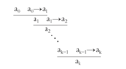 为了集中探讨连锁推理问题,我们详细地来看一下下面这个论证。假设杰克就是那个5岁的孩子。我们用a0来表示句子“零秒之后杰克是个孩子”,用a1来表示句子“一秒之后杰克是个孩子”。如n是任意一个数字,那么an则表示句子“n秒之后杰克是个孩子”。假设k是个非常大的数字,至少有630,720,000那么大。我们知道,an是正确的。(在零秒之后,杰克仍然是5岁。)对于每个数字n,我们进行以下条件推理:an →an+1。(如果杰克在任何时间是一个孩子,那么他在一秒钟之后仍然是孩子。)我们可以采用“假言推理”的推理顺序把所有这些前提联结起来:
