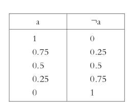 那些包含否定和合取等算子的句子的情况又是怎样的呢?随着杰克长大,“杰克是个孩子”的真值就降低了。“杰克不是个孩子”的真值就逐渐增加。这表明,﹁a的真值就是1减去a的真值。假如我们把a的真值写作|a|,那么,我们便可得到: