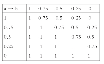 (符号<表示“小于”,≤表示“小于或等于”。)因此,如果条件句的前件不像后件那么正确的话,那么该条件句完全为真。如果前件比后件更加正确,那么条件句的真值就小于最大值减去前件和后件的真值之差。下表列出了某些样例的真值情况。(a的真值列于左边这一列,向下递减;b的真值列于表顶部那一行。)