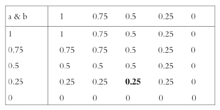 下表列出了某些样例的真值情况,a的真值列于左边一列,向下递减;b的真值列于表顶部那一行。相应的a&b的真值则列在纵横交汇处。比如说,我们要找到|a&b|的真值,而|a|= 0.25,|b| = 0.5,那么就找数字的纵横交汇处。结果用黑体标明了。