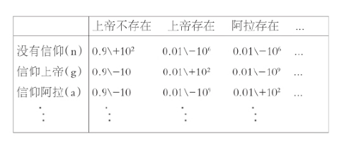 现在,我们再回到帕斯卡赌注的讨论上。在这个例证中,有两个可能的行为:相信或者不相信;并且存在两个相关的可能性:上帝存在或者不存在。我们可以用下表来描述相关的信息。