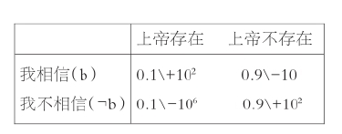 斜线左边的数字是相关概率,比如说,存在上帝的概率为0.1,不存在上帝的概率为0.9。(我是否相信对于是否存在上帝没有什么影响,因此表中两行中的概率是相同的。)斜线右边的数字是相关值。我不太关心上帝是否存在,重要的是我要让它正确;因此,这两种情况下的值为+102。(也许人们的偏好不会完全相同,但我们将会看到这没有多大关系。)如果上帝不存在却相信上帝的存在,就会有小小的不方便,因此赋予-10的数值。如果上帝存在却不相信他的存在,那确实就很糟糕了。我赋予它的值为-106。