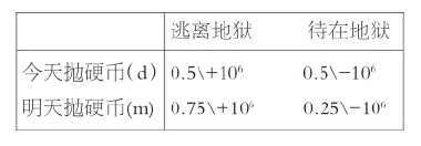 逃离地狱具有很大的正值,待在地狱具有很大的负值。而且,这些值不管是在今天还是在明天都是一样大。如果你等到明天抛的话,你也许就得在地狱里多待上一天,这是千真万确的;不过,这一天的时间与后面无穷无尽的日子相比可以忽略不计。于是你进行了下面的计算: