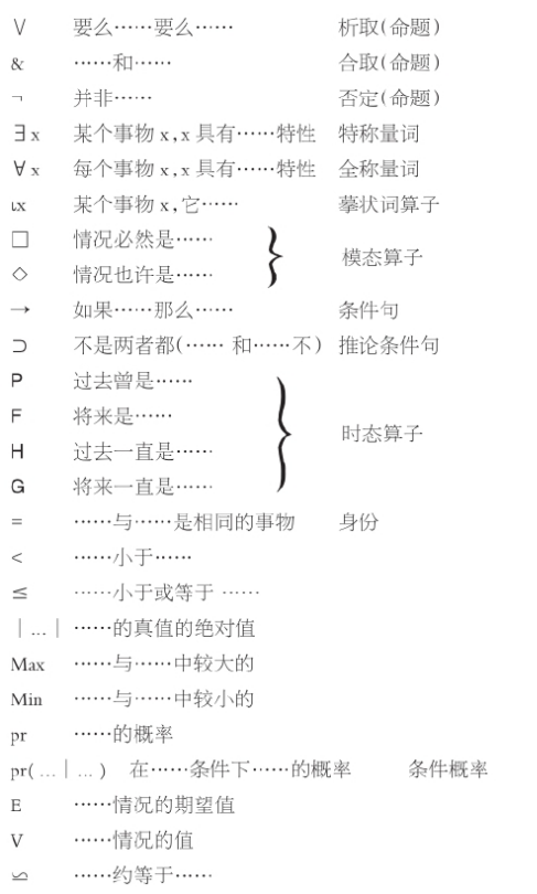 以下术语表包含了本书中所使用的专业术语以及逻辑符号。我们不打算为各个词条提供精确的定义,而是希望表达出主要意思,供快速参考。尽管还存在其他几组常用的符号,但总体来说,这里使用的术语和符号也都是相当标准的。