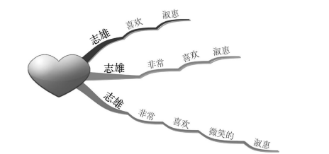 从规则中可得知,意思的表达是由必备的名词、动词,以及可有可无的副词、数量词、形容词组成。因此在思维导图法结构中,关键词的运用原则是以名词为主、动词次之,再加上必要的形容词、副词、数量词等。