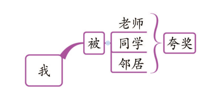 句子转换是指语词的添加、取消或重新排列。运用规则排列来产生句子的过程称为“派生过程”,最常见的转换语法是主动式转为被动式,例如“老师夸奖我”转为“我被老师夸奖”。这转换包含了复杂的派生过程。首先,两个名词调换了位置,第二个名词“我”调到第一个名词“老师”之前;其次,第一个名词“老师”之前加了一个“被”;原本在两个名词之间的动词,被调到两个名词之后。主动语态之所以能派生出被动语态,是因为两个句子的深层结构是一体。下图是这两种语态的思维导图。