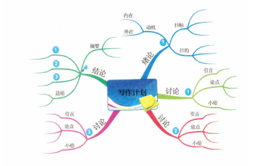 下页的思维导图是以小论文或期中、期末的报告为例。先从绪论中列出写作的目标,也就是撰写动机,并做出重点式的简短摘要;接着讨论与主题相关的各个议题,每个讨论议题都列出引言、论点,并做出重点小结;最后的结论以摘要列出讨论后的重点内容,并陈述获得的结论,最后提出个人见解为总结。