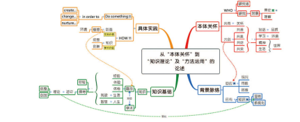 从220页的思维导图,逐步以类似上图的方式,发展完成“本体关怀”、“具体实践”、“知识基础”与“背景脉络”所有必须考虑的内容,接下来就可清晰梳理研究的概念与脉络,发展出论文章节架构的思维导图。