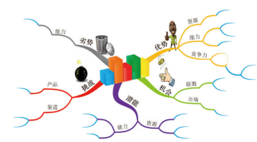 思维导图法的思考模式特别强调“正面积极”,然而“威胁”(Threat)给人负面的感觉。因此在思维导图法中以正面字眼“挑战”(Challenge)来取代。不但能以理性的方式比较,且能借此自省。