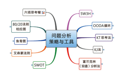 然而,分析问题与解决问题不见得只使用思维导图法,必须与各项策略或其他工具适当搭配,常见的策略与工具请参考下页图。