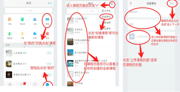 登陆后点击右下角“我的”按钮,在右上角点击“课程”。在课程界面点击“+”,选择“创建课程”。