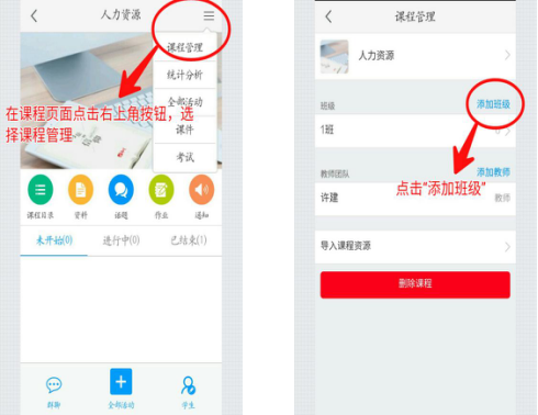 班级创建后,课程首页下方将展示班级教学活动页面。如果您还要添加更多的教学班级,请点击右上角菜单按钮,点击课程管理添加班级