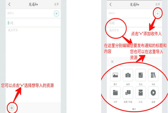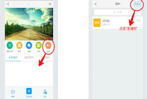 在课程页面点击“通知”可以查看和发放通知。进入通知页面后,在通知页面点击右上角“发通知”进入编辑页面,在编辑页面点击“+”可选择接受通知的班级,编辑完成后,点击右上角“发布”即可发出。通知将在学生端自动弹出,若学生端未打开,通知将通过系统进行即时推送。