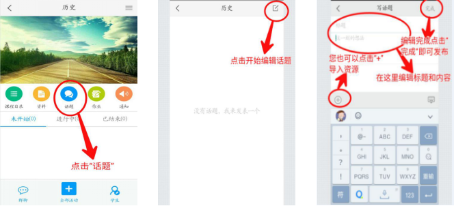 在课程页面点击“话题”可以查看已发布的话题和发布新话题。进入话题页面后,点击右上角的按钮,您可以在这里自主编辑想要发布的主题和内容,编辑完成后点击右上角的“完成”即可发布该话题。在话题页面中,您可以看到已发布话题的阅读量、评论和点赞数,和学生进行互动。