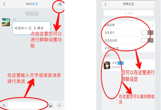 左下角“群聊”,进入群聊页面,您可以在这里和学生们进行沟通交流。如果您想不查看群聊消息、清空聊天记录或进行全员禁言设定,点击右上角按钮,进入群聊信息页面,进行相关设定。
