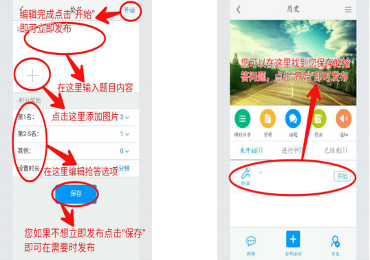 点击“+(全部活动)”按钮,选择抢答,进入到抢答页面。您可以在这里自主编辑课堂抢答问题的内容,还可以编辑抢答时长。编辑完成后点击“开始”即可发布,开始抢答。如果您觉得创建抢答需要时间,不方便临堂设置,您可以先编辑好问卷,点击下方的“保存”而非右上角的“开始”,则问卷会出现在活动页面的“未开始”一栏中。您可以随时点击右侧的“开始”将其发布。
