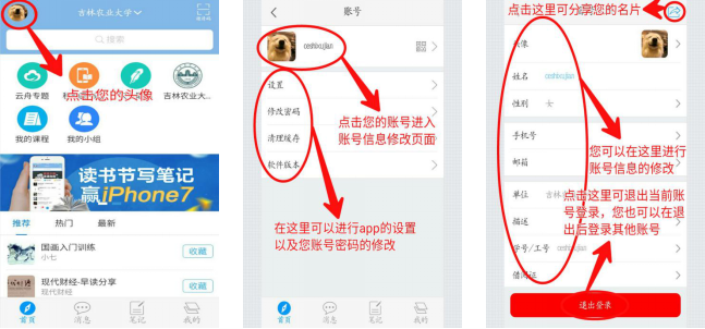 当您登陆超星学习通APP后,如果您想查看或修改自己的信息,点击左上角的头像,进入到账号页面。您可以在这里进行修改密码;点击设置可以调整添加好友的模式;点击您的头像进入到账号管理页面,在这里您可以自行编辑您的头像、邮箱、电话号等个人信息,同时当您想切换账号或退出当前账号更换其他账号时,点击最下方的退出登录,即可返回到登录界面;如果您想将自己的名片发送给他人,点击右上角按钮,选择你想发送到的位置即可。