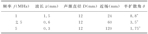 表1-1 不同频率超声、声源直径不变的近场距离与远场扩散角