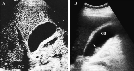 1.正常含液体的脏器 如胆囊、膀胱、心脏、血管等,周围组织-腔壁-液体之间的界面回声,腔壁的厚度。液体为无回声区(图1-12A)。当在病理情况下,含液脏器壁或液体中有异常时,正常超声图被破坏。
