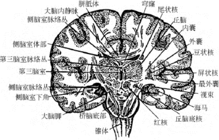 (3)软脑膜:为血管膜,紧贴脑组织,在脑室某些部位同血管一起突入脑室内形成脉络丛组织。