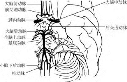 (1)脑动脉:由颈内动脉(ICA)和椎动脉(VA)供应脑部血流,二者均自颅底入颅。ICA于颅中窝两侧破裂孔入颅,沿途发出眼动脉,大脑前动脉(ACA)及终末支大脑中动脉(MCA)。VA入颅后至桥脑后缘合并成基底动脉(BA),沿途主要发出小脑后下动脉(PICA)和终末支大脑后动脉(PCA)。PCA、后交通动脉、ACA及前交通动脉组成脑底动脉环(Willis环),见图4-4。
