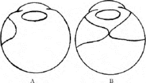 (4)视网膜接吻征,脉络膜脱离范围大,使其两对侧表面覆盖的视网膜接触(图5-5B)。