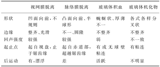 2.鉴别诊断 视网膜脱离应与玻璃体内其他膜状回声进行鉴别(表5-1)。