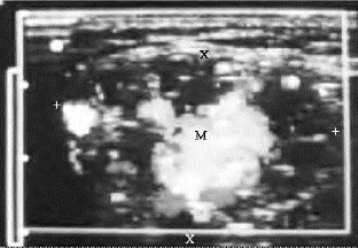 (1)瘤体边界尚清,外形较规则,常呈圆形或梭形,内为较粗的低回声,分布欠均。