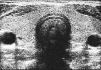 2.纵切面 在气管两侧做纵切面扫查,可以显示甲状腺两侧叶的长轴,呈上、下两极较尖锐的长纺锤形,内部回声同横切面图像。密集光点内常可看到细小管道样结构,为甲状腺内小血管。该切面可以测量甲状腺两个侧叶的上下径。在中间纵切,可以显示峡部的上下径,仔细检查有时可以显示锥状叶。