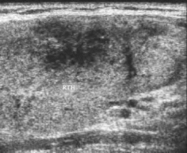 甲状腺右叶肿大,内部模糊的低回声