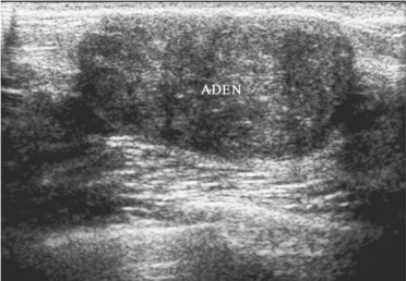超声表现:位于乳腺皮下脂肪层内,基本为椭圆形,边界大致清楚,但往往无明确包膜,内回声较脂肪组织略强,分布不甚均匀,内部一般无彩色血流。