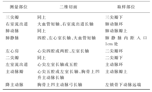 1.切面选择及取样部位 脉冲多普勒超声心动图检查,通常是在彩色多普勒超声心动图显像的基础上进行取样。测定房室瓣血流速度时,取样容积置于瓣下0.5~1.0cm处或彩色多普勒血流色彩明亮与彩色混叠处;测定半月瓣血流速度时,取样容积置于瓣上0.5~1.0cm处或彩色血流图色彩明亮与彩色混叠处。进行血流定量分析时,取样容积置于瓣环水平取样。正常心脏取样部位见表10-6。