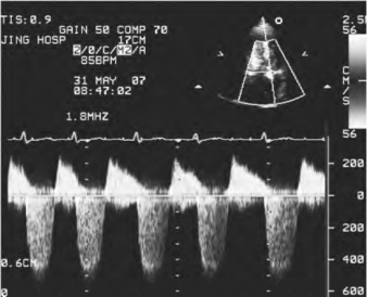 ①异常高速血流频谱:连续波多普勒取样线于彩色反流束处取样,可记录到收缩期负向单峰高速血流频谱,反流速度多数≥4m/s(图13-9),反流压差≥8.53kPa(64mmHg)。
