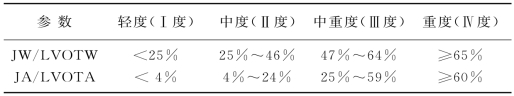 研究显示JW/LVOTW和JA/LVOTA与X线造影和其他方法测量主动脉瓣的反流分数具有较好的相关性,相关系数达0.85~0.95。临床上用此方法可以对90%以上患者的主动脉反流程度作出正确的判断;但当反流口不呈圆形时,则影响JW/LVOTW判断的准确性。