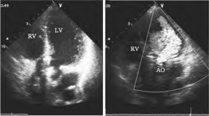左图为心尖五腔切面示主动脉位人工瓣环强回声及与二尖瓣环部之间裂隙,右图示舒张期彩色多普勒由此处进入左室的反流束