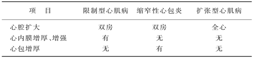 在超声心动图检查方面,限制型心肌病应注意与缩窄性心包炎或扩张型心肌病相鉴别,鉴别要点见表20-2。