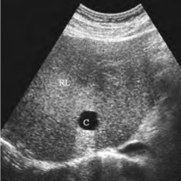 1.肝内见圆形或椭圆形无回声区,边界清楚,壁薄,内部极清晰,后方回声增强(图23-10)。