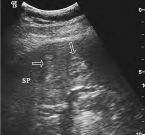 脾大,箭头所示低回声区为淋巴瘤。SP:脾脏