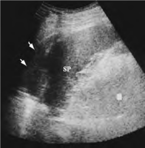 超声可直观显示脾脏真性破裂及实质或包膜下的血肿。当出血量少、创伤较轻时,超声不易显示脾破裂处,但可根据脾周积液(血)及腹腔积液(血),结合外伤史判断脾外伤的存在,应在报告上注明检查时间,密切观察随诊。