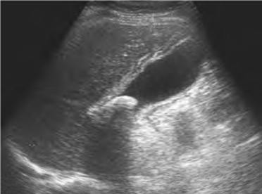 (1)常见表现为胆囊缩小或大小正常,胆囊壁增厚达0.4cm以上,或壁不光滑,毛糙(图25-5)。