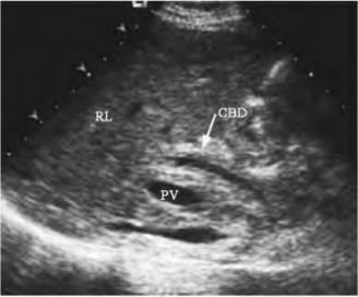 (1)乳头型:扩张的胆管内见乳头状软组织肿块,胆汁与肿块界面形成倒“U”字形。可为低回声至中等回声,分布不均匀,边缘不整齐,无声影,位置固定(图25-14)。