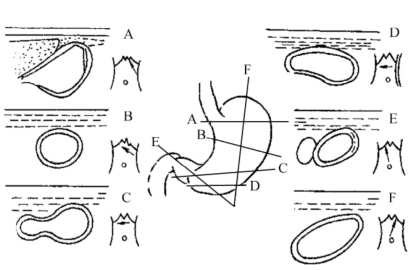 A.贲门胃底斜切面;B.胃体短轴切面;C.胃窦及胃体角切迹部横切面;D.胃窦及胃体短轴切面;E.幽门及十二指肠球部切面;F.胃体胃底长轴切面